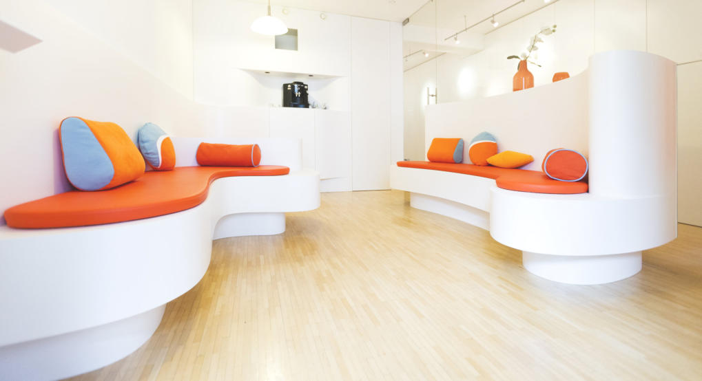 Ein Entwurf für die Sitzmöglichkeiten des Wartebereichs, der sich in den Bestand der Innenarchitektur einfügt.